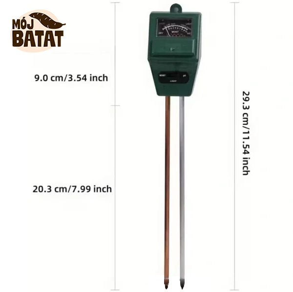Trzyfunkcyjny miernik gleby, dzięki któremu jednym urządzeniem sprawdzisz wilgotność gleby pod bataty, pH oraz ilość światła docierającego do roślin.